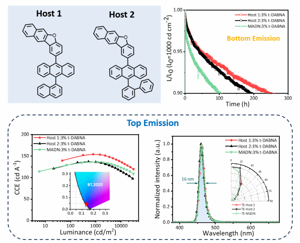 藍光有機發光二極管(OLED)作為有機顯示和照明技術的重要組成部分,其發展受到效率和穩定性的雙重挑戰,特別是商用藍色OLED的效率和壽命相對較低,亟需進行技術突破。本論文研究了兩種新型蒽-二苯并呋喃為骨架的主體材料,通過摻雜窄光譜多重共振熱活化延遲熒光(MR-TADF)藍光發光體作發光層,成功構建高性能p-i-n型OLED器件,實現高色純度的深藍光發射(發射峰位于463 nm,半高全寬FWHM=26 nm),更將器件在1000 cd m?2初始亮度下的壽命(LT90)提升至249小時。通過瞬態電致發光以及激子動力學理論計算闡明了該三線態-三線態上轉換(TTA)熒光發光過程中低效率滾降特征及存在的激子損耗過程。為了挖掘此類主體材料在實際應用中的潛力,本研究進一步構建頂發射型器件,受益于微腔結構TE-OLED器件的發光光譜半峰寬縮減至16 nm,從而獲得了幾乎滿足BT.2020 標準(超高清電視色彩和圖像格式國際標準)的純藍光發射(CIE坐標:(0.136, 0.048),電流效率CCE高達154.3 cd A?1)。該研究不僅為蒽基TTA主體材料的設計策略提供了新的視角,更為開發更加穩定的窄帶發射深藍光OLED 器件開辟了新的道路,將進一步推動有機發光技術的發展。