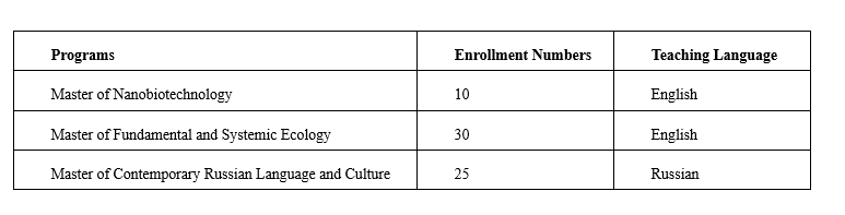 In 2017, the University plans to recruit graduate students for three majors, namely, Nanobiotechnology (conducted in English), Fundamental and Systemic Ecology (conducted in English),and Contemporary Russian Language and Culture (conducted in Russian). All majors above shall follow the Master’s educational program ofM. V. Lomonosov Moscow State University.