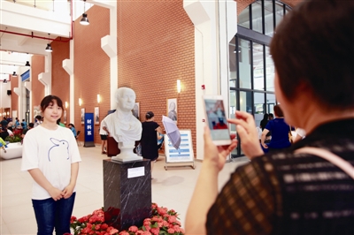 坐落在學(xué)校前門(mén)的圖書(shū)館,被透明的橢圓形窗戶包圍著,遠(yuǎn)遠(yuǎn)望去極具莫斯科風(fēng)情。圖書(shū)館外的長(zhǎng)廊里豎立著莫斯科大學(xué)奠基人——羅蒙諾索夫的白色雕像,眾人爭(zhēng)相合影。走廊里,校方豎立了四塊藍(lán)底白字的招生專業(yè)顯示牌:俄語(yǔ),數(shù)學(xué)與應(yīng)用數(shù)學(xué),材料科學(xué)與工程,國(guó)際經(jīng)濟(jì)與貿(mào)易。每個(gè)顯示牌前,都有專業(yè)的招生老師為家長(zhǎng)、考生進(jìn)行詳細(xì)講解。