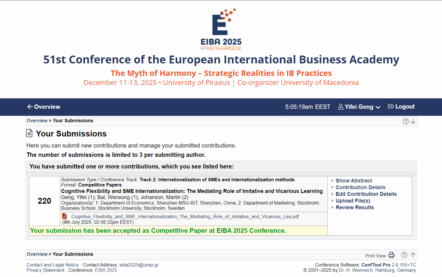 EIBA成立于1974年,是國際商務領域歷史最悠久、規模最大的學術組織之一,致力于推動國際商務研究的學術交流、理論創新與實踐應用。其年度旗艦會議Conference of the European International Business Academy(歐洲國際商務學會年會)是國際商務領域的頂級學術盛會,今年已舉辦至第51屆,每年吸引來自全球數十個國家的知名學者、博士研究生及企業代表參與,展示前沿研究成果,交流最新學術思想。學校兩篇本科生論文被該會議接收,充分體現了深北莫學子在科研能力、國際化視野與學術創新方面的不斷提升。