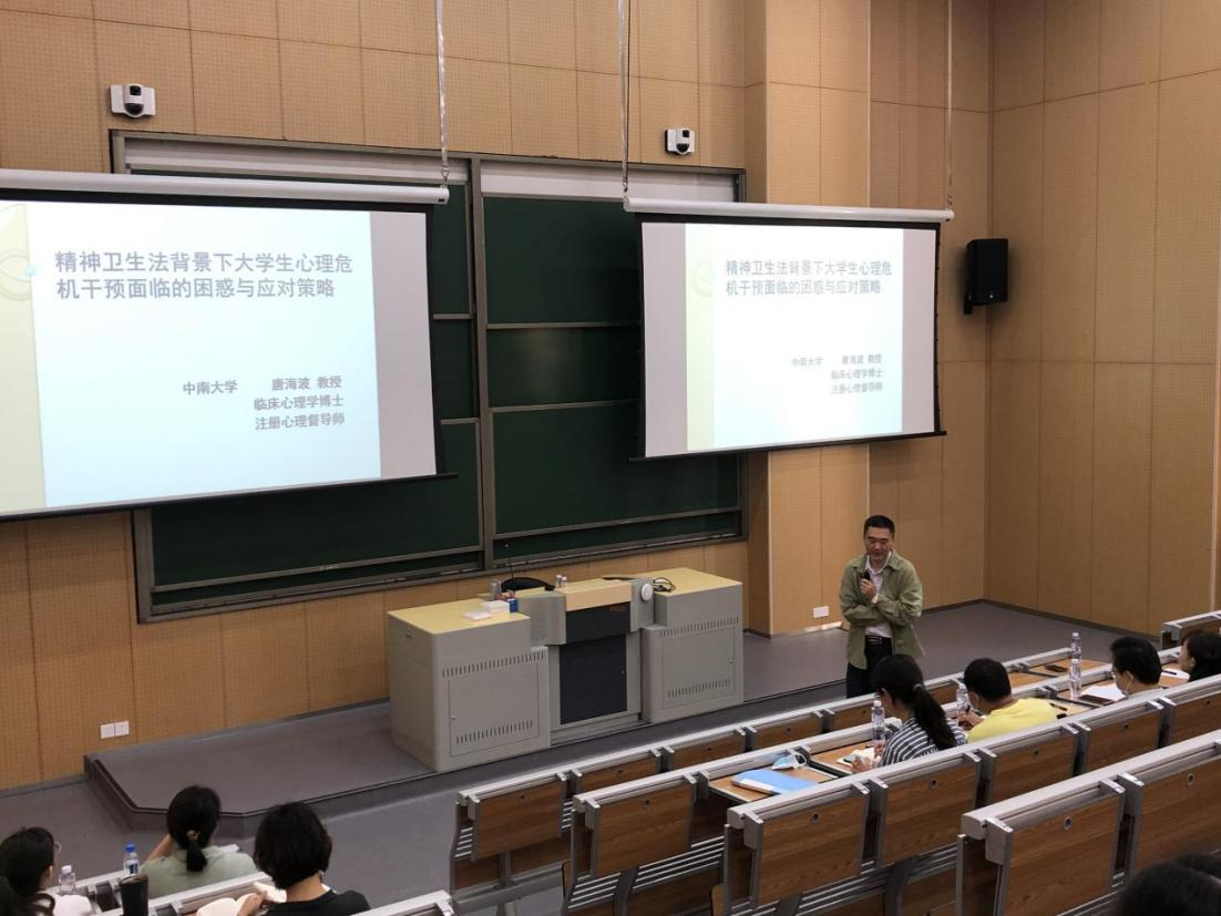 (圖為 中南大學(xué)心理咨詢專家唐海波教授面向教職工開展培訓(xùn))