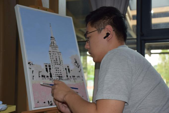 在張曉睿同學的組織下,看上去神奇的油畫,分解成了一份份小小的色塊,通過大家團結合作,最終共同“施法”抹出了深北莫主樓這一“宏偉巨制”。