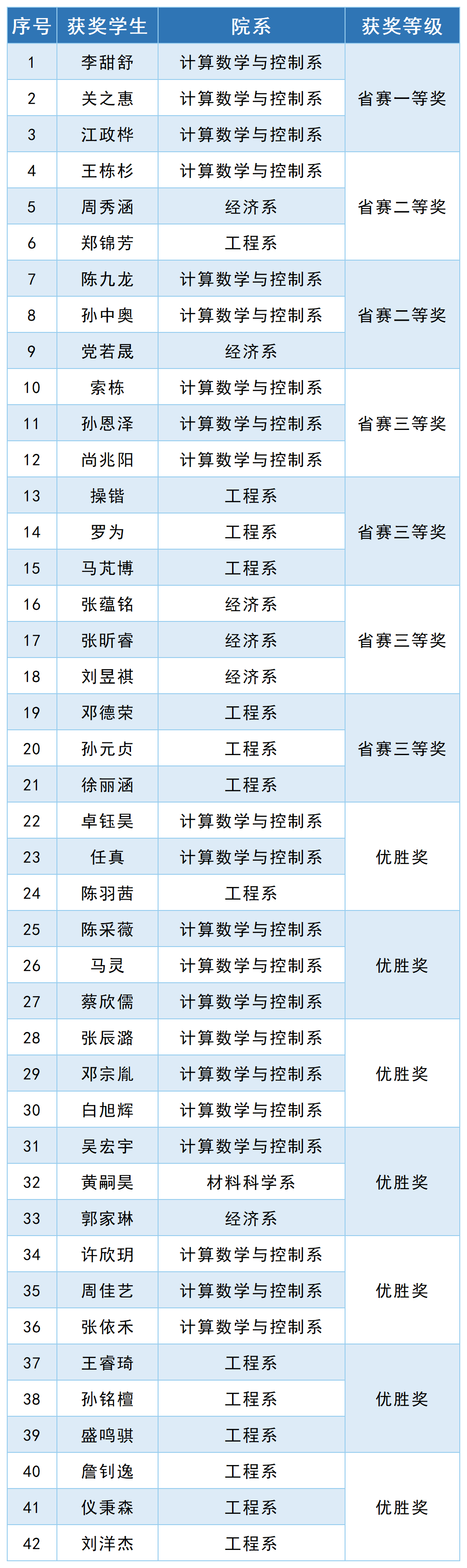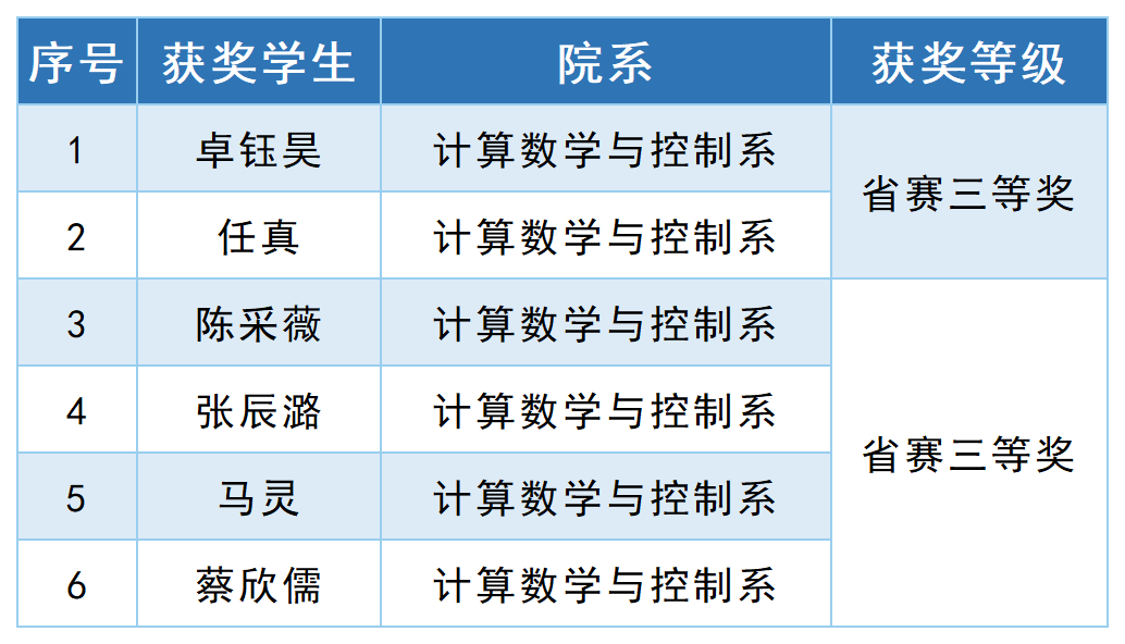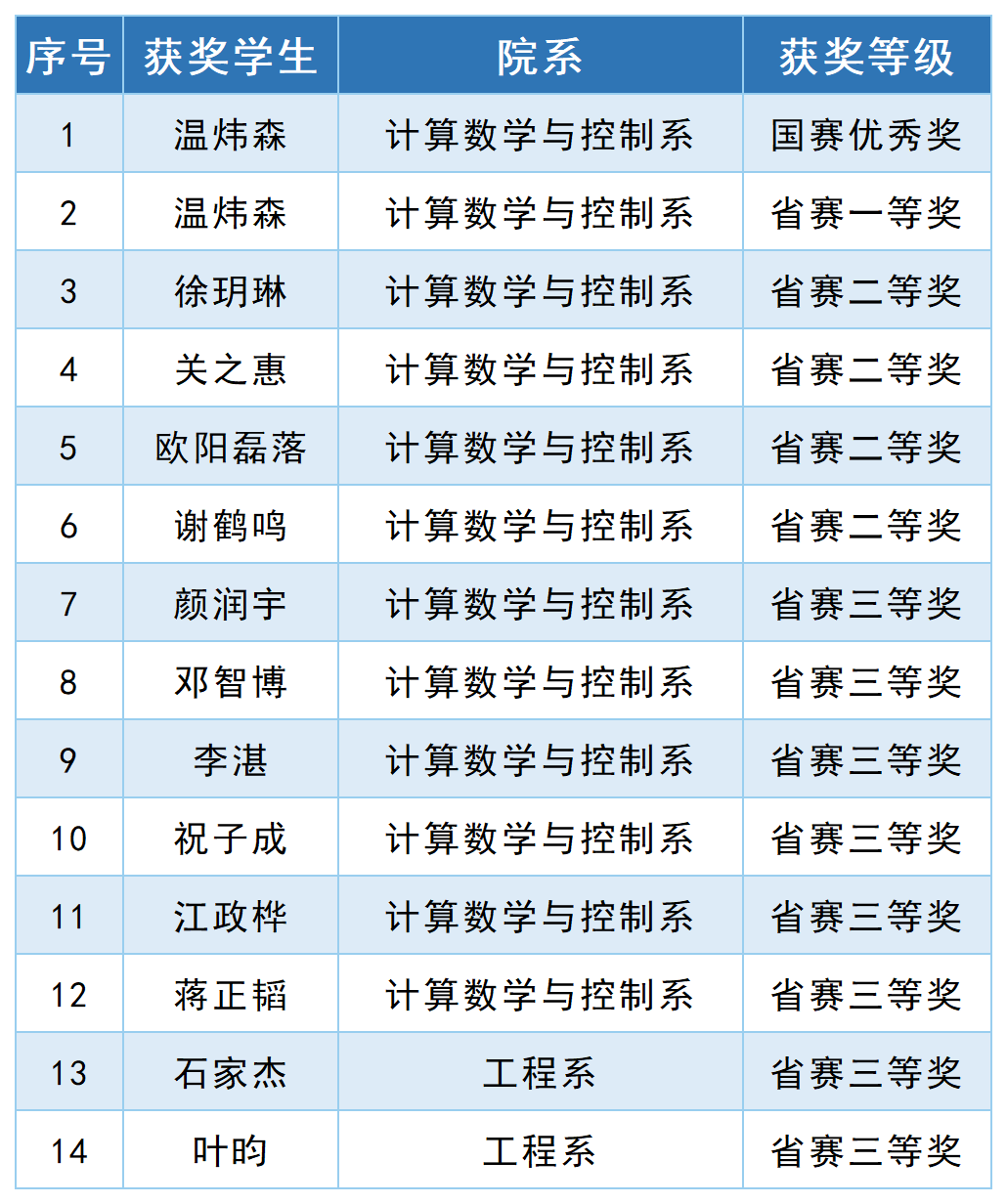 在2022年全國大學生數(shù)學建模競賽中,學校共有14支隊伍獲獎,與2021年相比,共增加8支獲獎隊伍。其中,1支隊伍獲得省賽一等獎,2支隊伍獲得省賽二等獎,4支隊伍獲得省賽三等獎,其余隊伍獲得優(yōu)勝獎。其中,省賽一等獎的獲獎隊伍是來自計算數(shù)學與控制系的三名學生李甜舒、關之惠與江政樺。