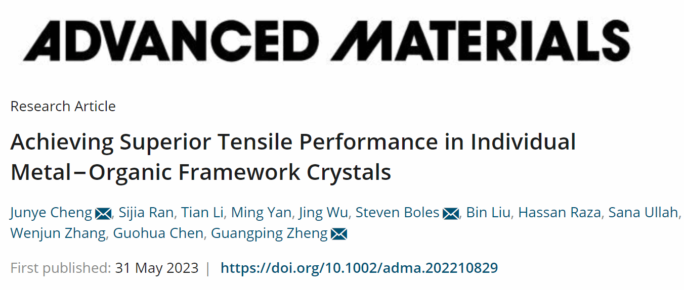 近日,深圳北理莫斯科大學材料科學系程俊業副教授研究團隊,在材料頂級期刊《Advanced Materials》(IF=32.086)上發表了題為“Achieving Superior Tensile Performance in Individual Metal?Organic Framework Crystals”的研究論文(DOI: 10.1002/adma.202210829)。程俊業為第一作者兼通訊作者,深圳北理莫斯科大學為第一通訊單位。該成果也是我校首次以第一單位和通訊單位在該期刊上發表研究成果。