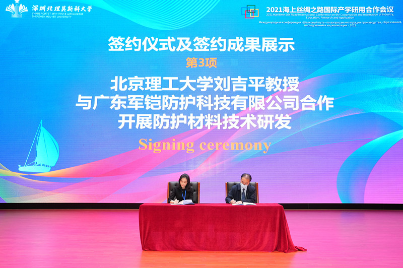 北京理工大學劉吉平教授委托深圳北理莫斯科大學材料科學系第一副主任李樹奎教授與深圳市名仕度服飾有限公司簽署成果轉讓協議,會上展示了北京理工大學材料學院劉金旭教授科研成果轉讓簽約照片和與會單位中外聯合培養研究生達成的初步意向。