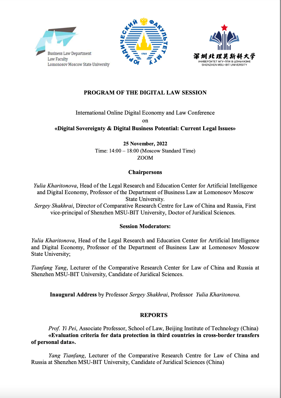 11月25日,深圳北理莫斯科大學中俄法學比較研究中心和莫斯科大學法律系人工智能與數字經濟法研究中心聯合舉辦“數字主權與數字經濟的潛力:當前法律問題”論壇。會議以線上形式舉辦,會議語言為英語,該活動同時也是由俄羅斯聯邦司法部、莫斯科大學、莫斯科法律大學等多方在每年聯合舉辦的“莫斯科法律周”框架下的活動之一。