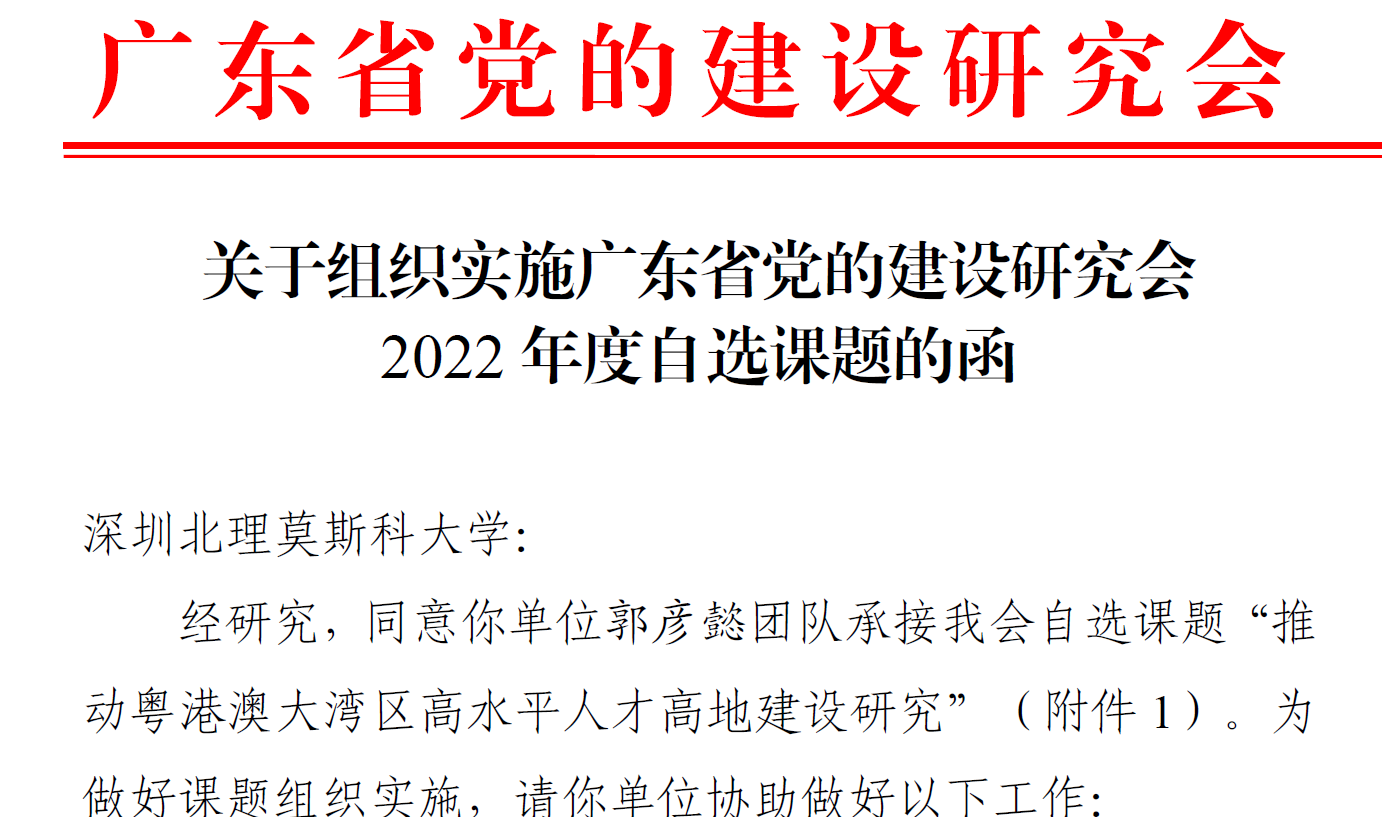 近日,廣東省黨的建設(shè)研究會(huì)公布了2022年自選課題立項(xiàng)名單。深圳北理莫斯科大學(xué)郭彥懿《推動(dòng)粵港澳大灣區(qū)高水平人才高地建設(shè)研究》課題獲得立項(xiàng)。
