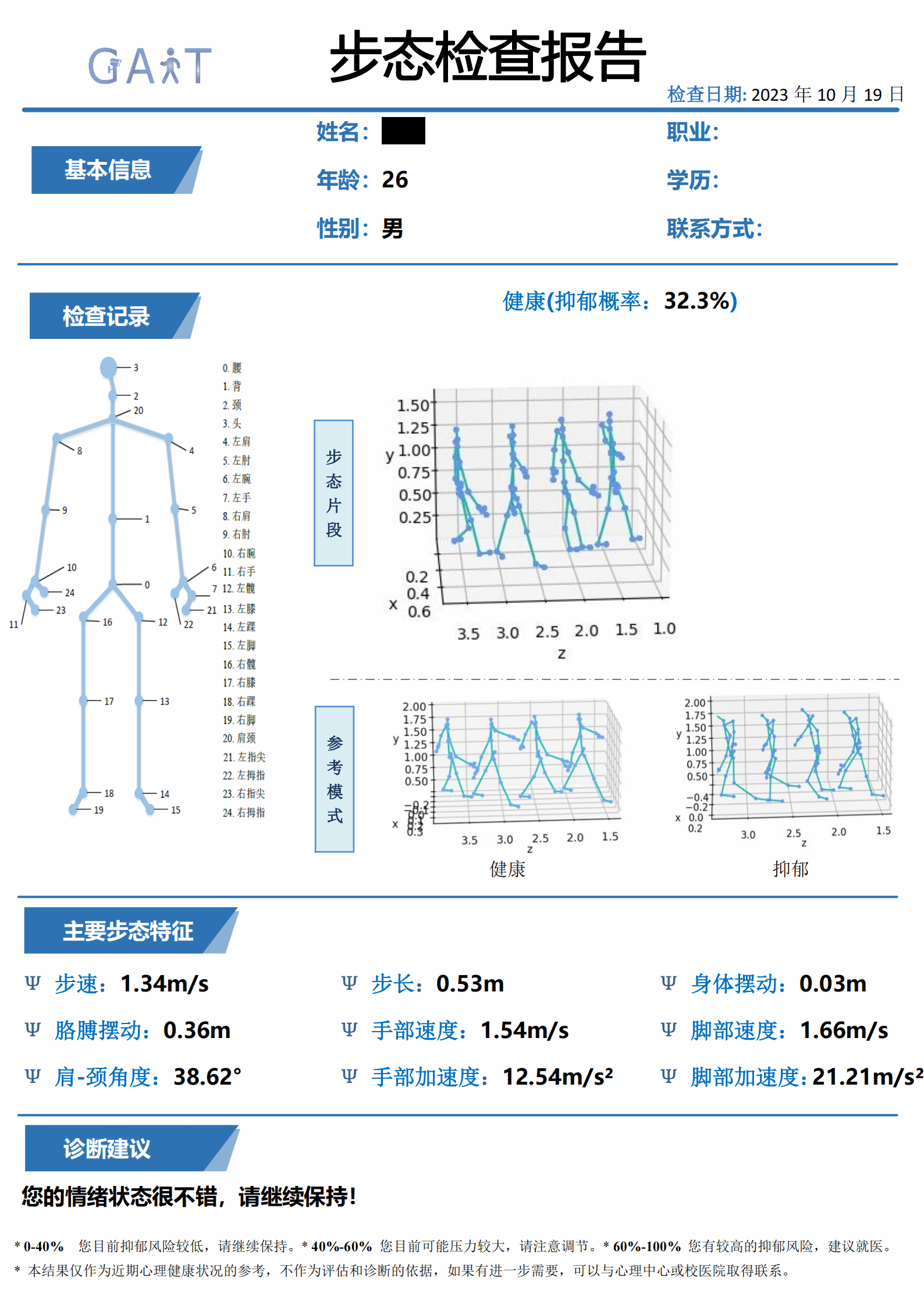 基于智能步態(tài)分析的無擾式抑郁癥檢測系統(tǒng)由深圳北理莫斯科大學(xué)人工智能研究院的胡希平教授團(tuán)隊(duì)獨(dú)立研發(fā)。該系統(tǒng)借助計(jì)算機(jī)視覺和大數(shù)據(jù)分析等技術(shù)手段,以抑郁癥患者與健康人在日常運(yùn)動步態(tài)信息中的差異為切入點(diǎn),通過計(jì)算機(jī)模型分析識別出異常步態(tài)特征,從而實(shí)現(xiàn)對檢測對象患抑郁癥概率及程度的無擾式判別。此系統(tǒng)可與日常生活中廣泛部署的視頻監(jiān)控相結(jié)合,實(shí)現(xiàn)對目標(biāo)群體的快速、無干擾的、智能的、大規(guī)模的潛在抑郁癥篩查。該系統(tǒng)已成功應(yīng)用到空軍總醫(yī)院、解放軍第261醫(yī)院、北師大認(rèn)知神經(jīng)科學(xué)國家重點(diǎn)實(shí)驗(yàn)室、北京協(xié)和醫(yī)院、北大六院、湘雅二院、深圳市人民醫(yī)院等國內(nèi)高校、醫(yī)院、部隊(duì)完成10000+例實(shí)驗(yàn),初步臨床實(shí)例實(shí)驗(yàn)證明抑郁癥診斷準(zhǔn)確率可達(dá)80%。