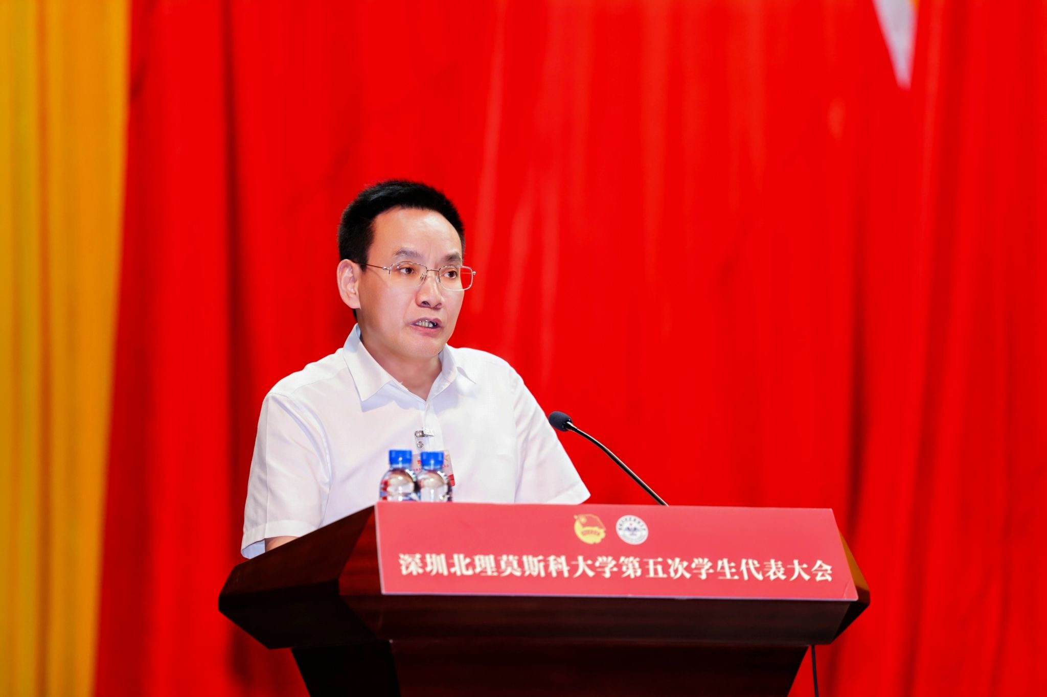2025年6月10日,深圳北理莫斯科大學第五次學生代表大會在學校禮堂召開,來自全校各系的104名學生代表齊聚一堂。校黨委副書記、紀委書記陳超峰,副校長助理萬美娜,團委書記謝歡欣,條件保障部部長高英,學生工作部部長張楊,深圳市學生聯合會駐會主席劉奔騰出席開幕式。