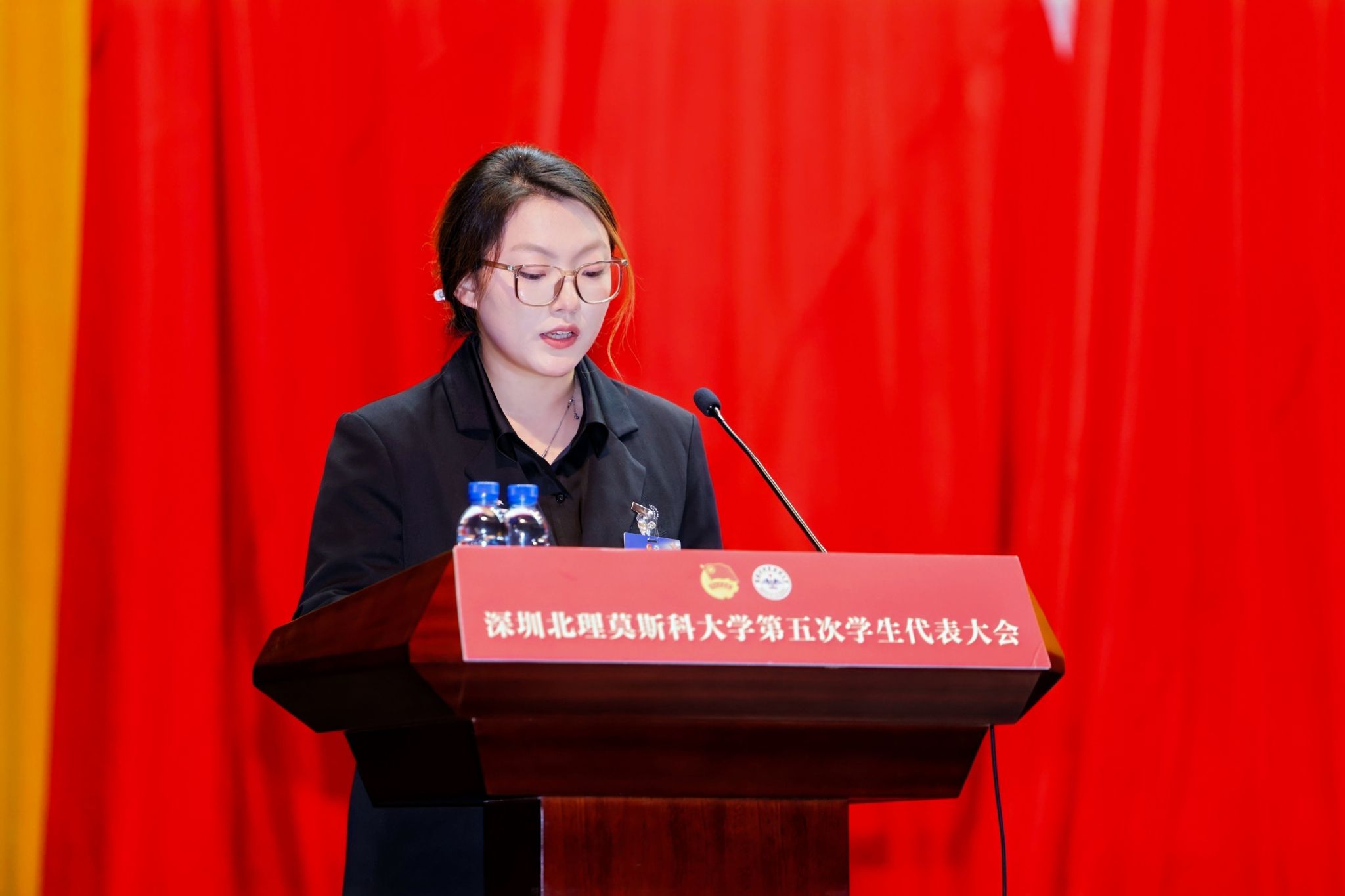 深圳北理莫斯科大學第四屆學生會主席團成員任子萱向大會作題為《匯聚青春之力,賦能強國使命,團結帶領深北莫青年為加快建設獨具特色、世界一流綜合性研究型大學奮力譜寫青春華章》的工作報告。