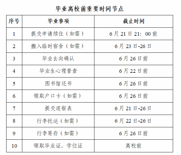 畢業生須在6月26日前辦理退宿手續,并最遲于6月26日17:30前搬離宿舍,以便宿舍維修、保潔和秋季開學工作的順利開展。畢業生離校前應將房間清理干凈,為學弟學妹留下文明整潔的住宿環境。