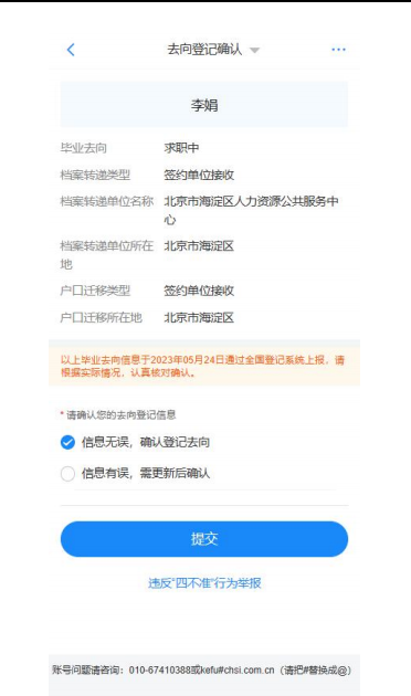 (1)若信息無誤,選擇“信息無誤,確認登記去向”提交。