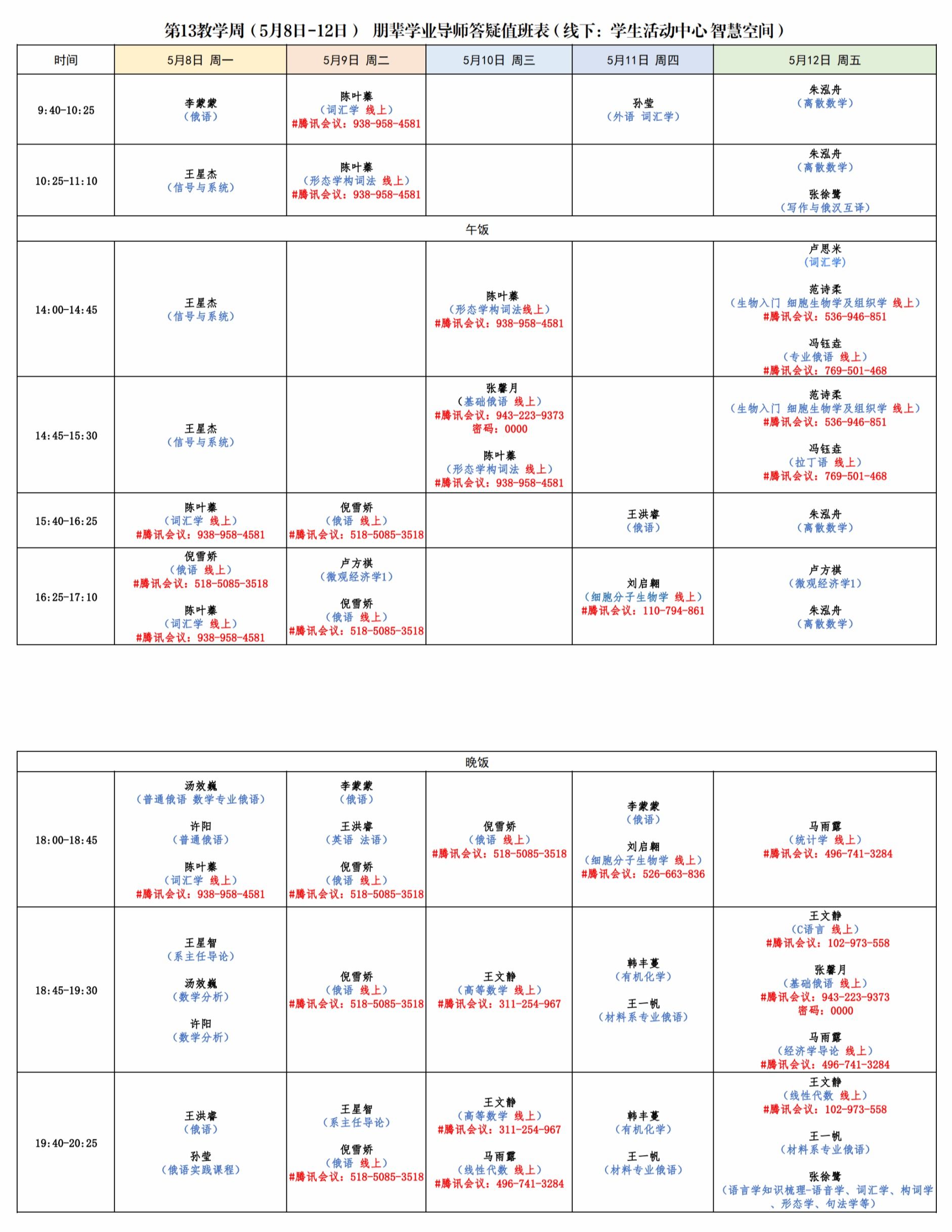 現(xiàn)將第13教學(xué)周(5月8日-12日)朋輩學(xué)業(yè)導(dǎo)師答疑值班表公布如下。各位同學(xué)可根據(jù)個人學(xué)習(xí)需求進(jìn)行線上線下咨詢。(注:線下答疑地點為學(xué)生活動中心智慧空間,線上平臺為騰訊會議)