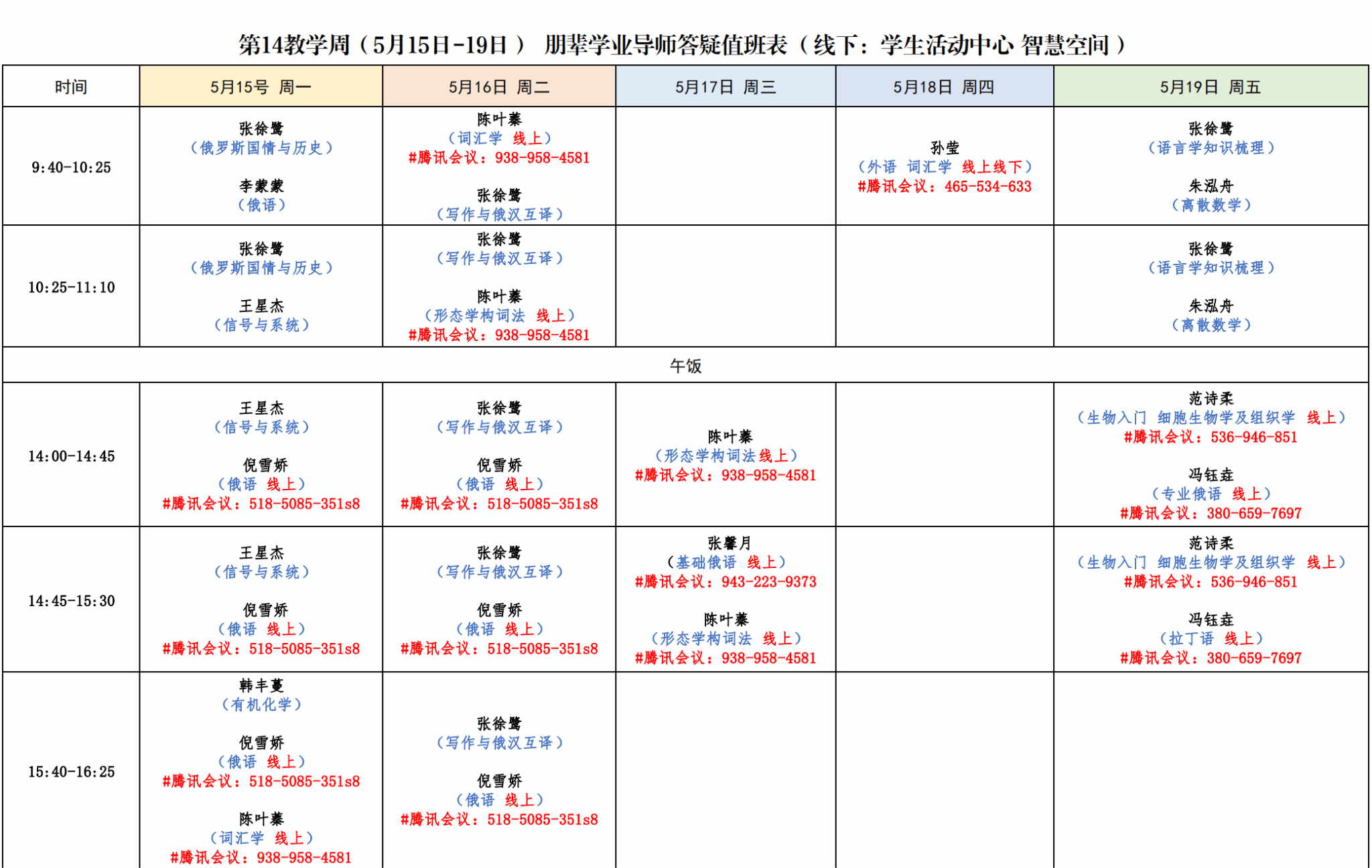現將第14教學周(5月15日-19日)朋輩學業導師答疑值班表公布如下。各位同學可根據個人學習需求進行線上線下咨詢。(注:線下答疑地點為學生活動中心智慧空間,線上平臺為騰訊會議)