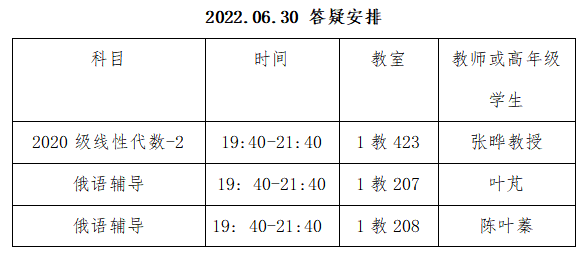 為幫助廣大同學(xué)更好的準(zhǔn)備期末考試,從6月28日起,學(xué)校將組織中方教師和高年級學(xué)生為需要幫助的學(xué)生提供答疑服務(wù)。具體答疑的科目安排學(xué)校會每日更新,請同學(xué)們注意關(guān)注信息。祝同學(xué)們考試順利!(今日發(fā)布6月30日-7月1日答疑安排)