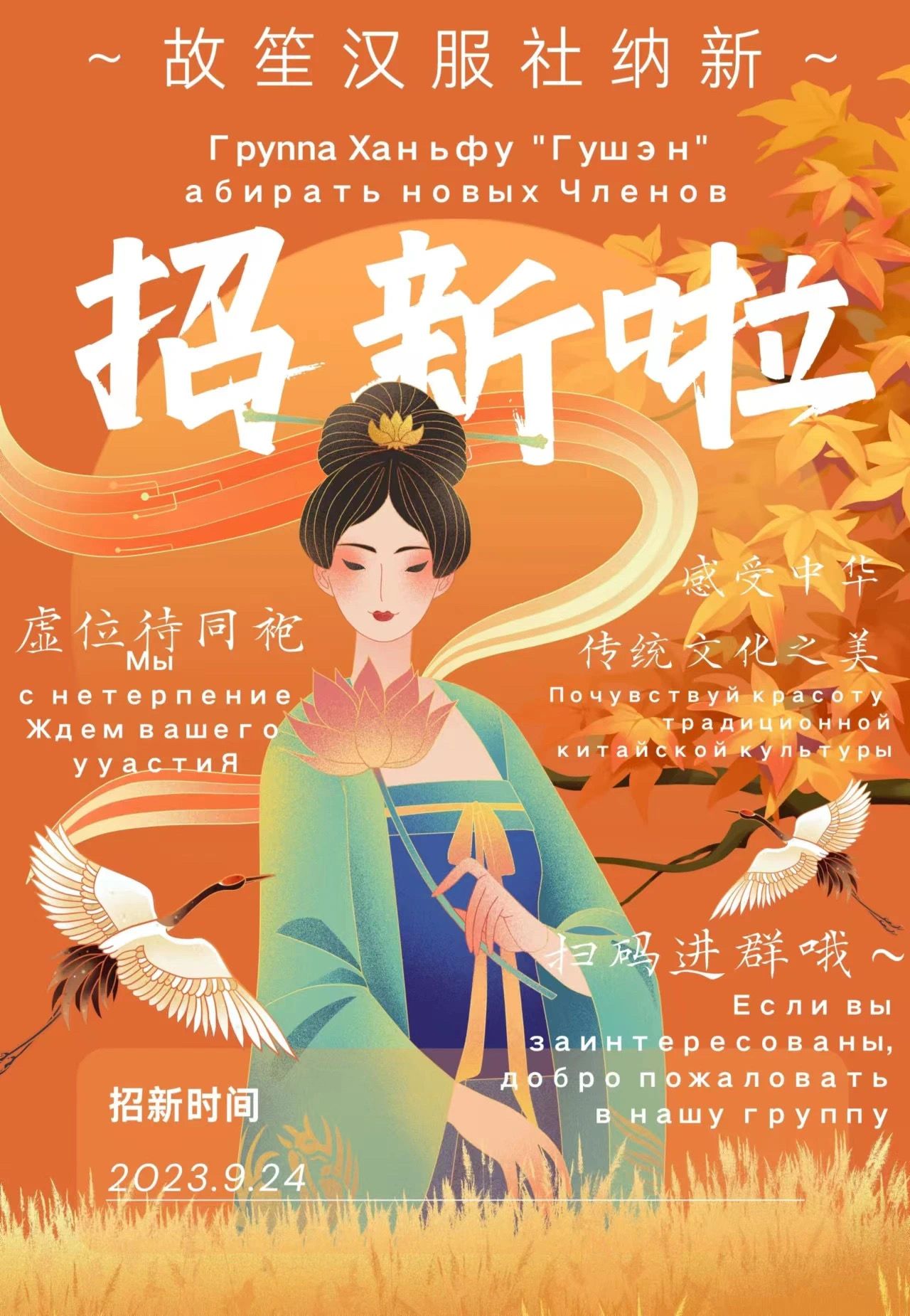 故笙漢服社成立于2019年10月,是由一群漢服愛好者創(chuàng)立的漢服組織,其成員為深圳北理莫斯科大學(xué)熱愛傳統(tǒng)文化和漢服的在校學(xué)生。秉持以“學(xué)習(xí)民族文化,傳承華夏文明”的宗旨,我社會(huì)為成員免費(fèi)提供漢服著裝,定期舉辦中秋雅集、漢服雅集以及花朝節(jié)等大型漢服集會(huì)活動(dòng),在活動(dòng)中,你可以學(xué)習(xí)漢服知識(shí),掌握額外技能;結(jié)交更多同袍,獲得展示機(jī)會(huì);同時(shí)還會(huì)有專業(yè)攝影師給你拍美美的古風(fēng)照片。最后再次歡迎每一個(gè)熱愛傳統(tǒng)文化的你。