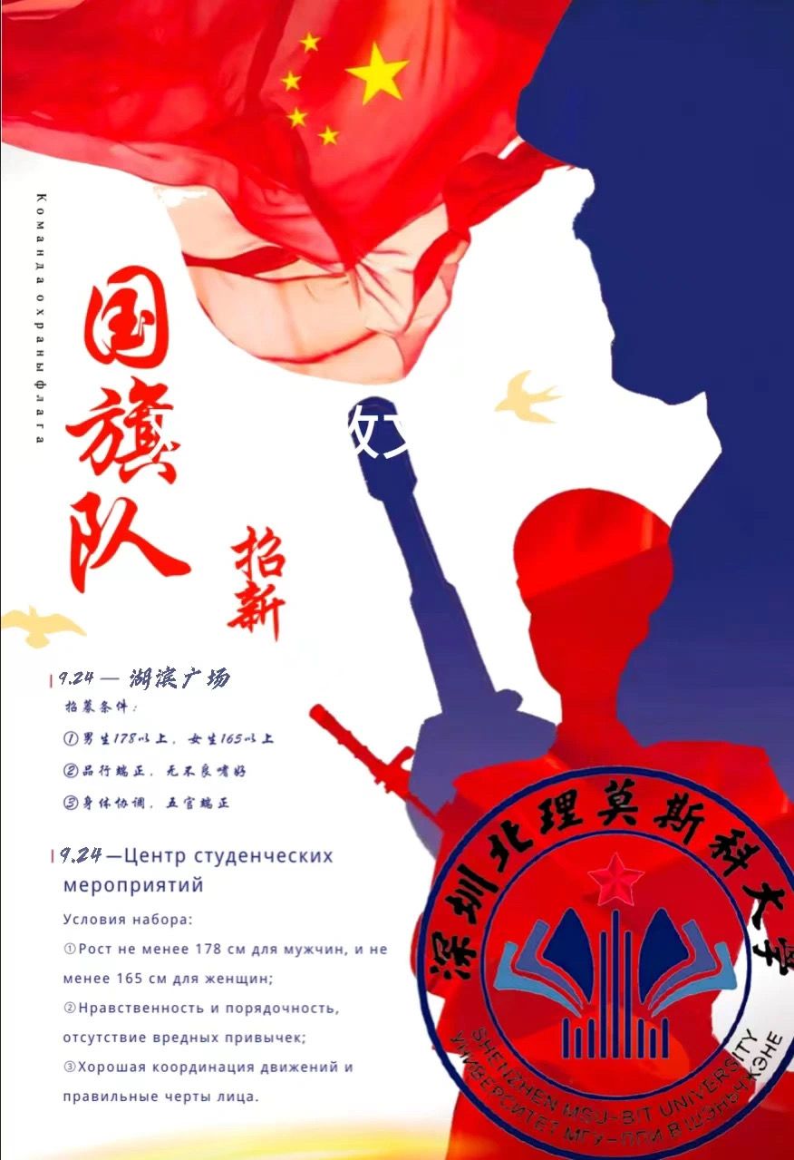 深圳北理莫斯科大學(xué)國旗護(hù)衛(wèi)隊(duì)是一個(gè)致力于守衛(wèi)國旗、維護(hù)國旗尊嚴(yán)的校園愛國主義教育類社團(tuán),成立于2020年。本社團(tuán)成員由熱愛祖國、熱愛校園文化的深北莫學(xué)子組成,具備高度的愛國主義精神和志愿服務(wù)意識(shí),同時(shí)也擁有豐富的社團(tuán)活動(dòng)經(jīng)驗(yàn)和專業(yè)技能。我們歡迎所有熱愛祖國、熱愛國旗的同學(xué)加入我們的大家庭。本社團(tuán)通過守衛(wèi)國旗和傳播國旗文化來弘揚(yáng)愛國主義精神,讓更多的人了解國旗的含義和重要性。主要活動(dòng)內(nèi)容包括國旗升降儀式、國旗護(hù)衛(wèi)任務(wù)、出席大型典禮活動(dòng)等。