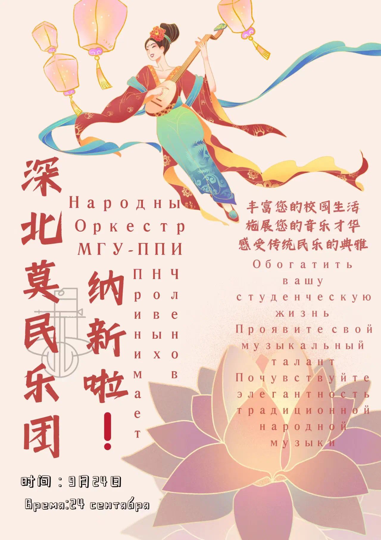 Народный Оркестр МГУ-ППИ был официально создан в 2021 году и является культурным и художественным объединением, распространяющим традиционную китайскую прекрасную музыкальную культуру.