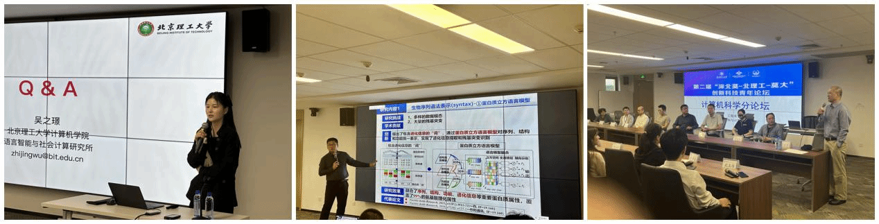 劉濱教授分享了基于自然語言處理的生物序列分析方法。劉濱教授長期從事交叉學科研究,針對生物序列、結構、功能與疾病的應用關系分析等,提出了基于自然語言處理的生物序列分析方法,在本次青年學者研討會分享了他們課題組在生物序列語法表示、生物序列語義檢測、生物序列語用分析等方面的研究進展,介紹了他們提出的生物序列語言模型、生物序列語義相似度計算方法和動態語境網絡分析方法等。然后和與會的同學們討論了關于AI for science中大模型、數據的動態變化等方面的研究技術,給大家帶來了交叉學科研究的新思路、新方法。