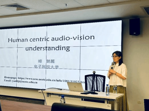 姬艷麗教授做了題為“圍繞人的音視多模態理解”的精彩報告。針對圍繞人所展開的音視多模態理解,通過對音視頻中的不同視角、不同模態信息進行挖掘和建模,探討了有監督、自監督、弱監督等學習模型實現不變視角行為識別、多模態情感理解、視線監督下的注意力估計等圍繞人的理解任務,并探討了有效人機交互途徑。