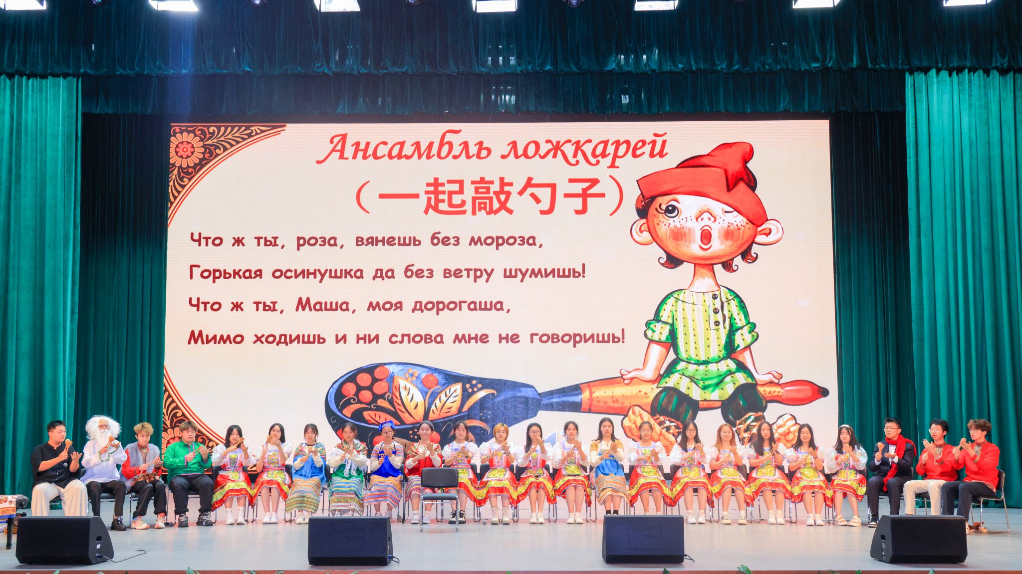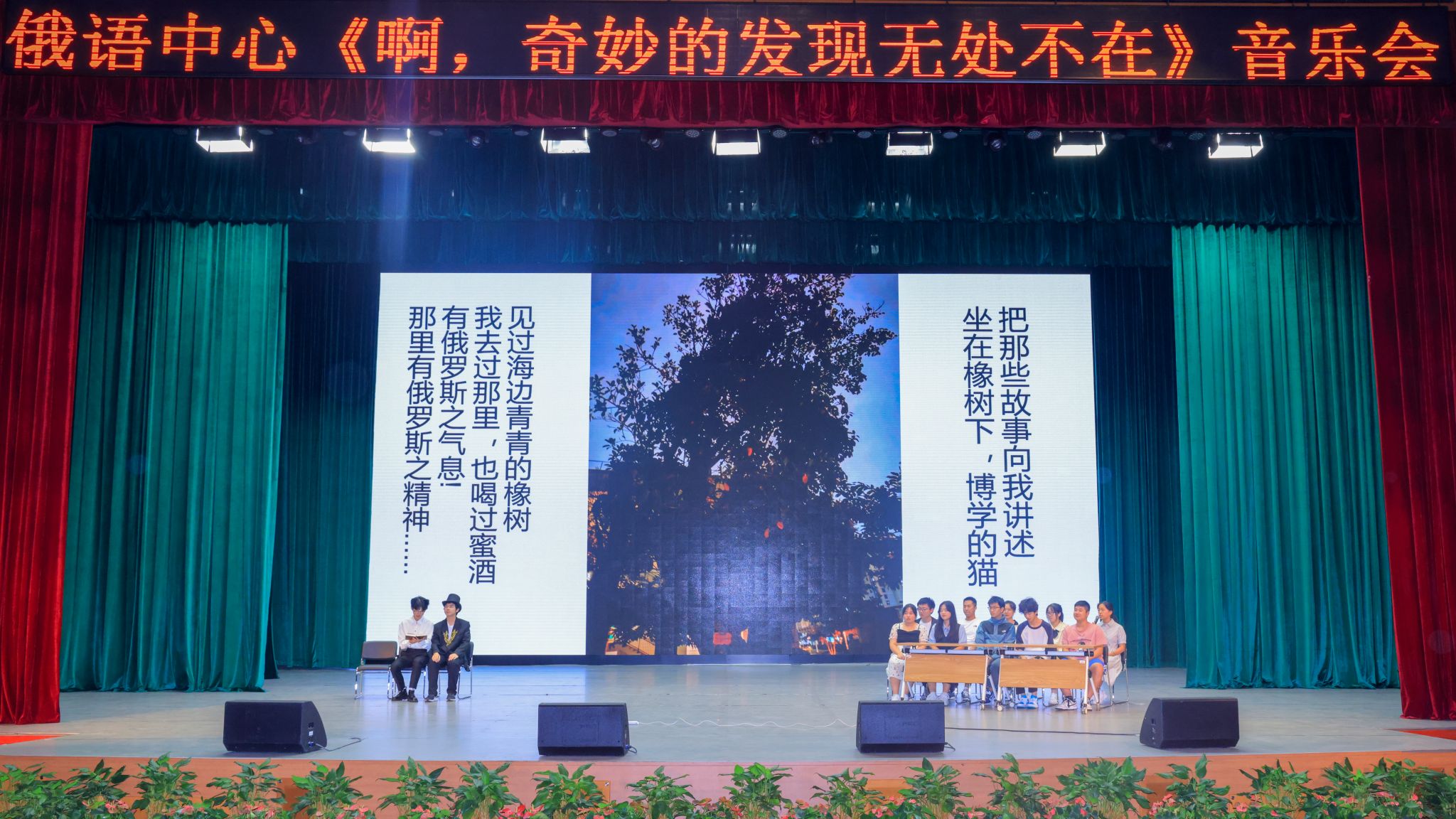 電影小組《注意:開機!》的同學們演唱了一首在中俄兩國都深受喜愛的歌曲《喀秋莎》,中俄雙語演唱的嘹亮歌聲響徹全場;國情文化小組《對話》把俄羅斯童話《斧子粥》改編成劇本搬上了舞臺,充分展現了同學們的表演和音樂才能。