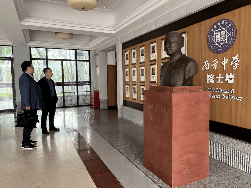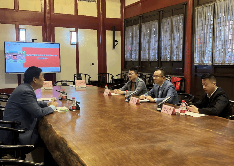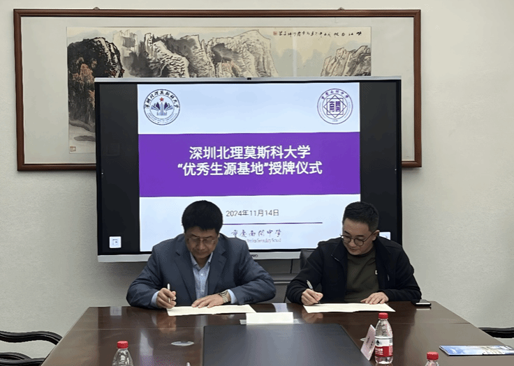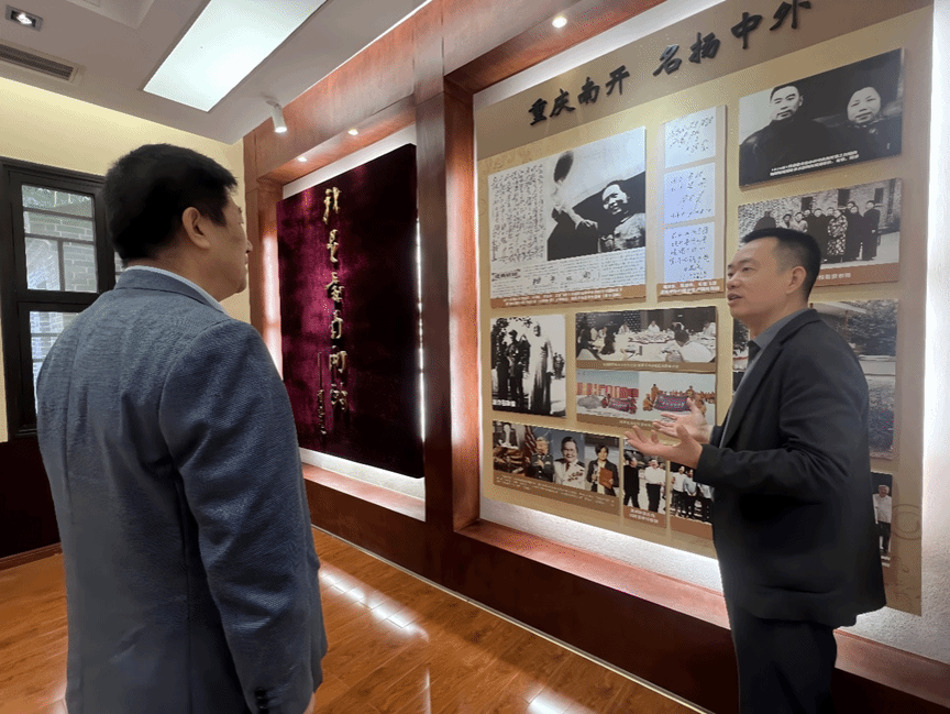 11 月 14 日,重慶招生組組長、化學(xué)系中方主任張東翔教授與秘書李嘉莉率先走進(jìn)南開中學(xué),與南開中學(xué)副校長吳燕春、教務(wù)處主任肖軍、教務(wù)處老師劉東展開了深入的交流。雙方圍繞教育合作與人才培養(yǎng)等關(guān)鍵議題進(jìn)行了熱烈探討,南開中學(xué)對深北莫的教育資源表現(xiàn)出濃厚興趣,希望學(xué)校能邀請俄羅斯數(shù)學(xué)專家院士到校舉辦科技報告,并對深北莫面向家長的宣講活動表示熱烈歡迎。在此次交流中,張東翔教授與吳燕春副校長成功簽訂了生源基地協(xié)議,標(biāo)志著雙方合作的正式開啟。隨后,張東翔教授向南開中學(xué)鄭重授予優(yōu)秀生源基地牌匾及銅盤,彰顯了兩校合作的重要意義。座談會后,肖軍主任熱情地帶領(lǐng)招生組參觀了南開中學(xué)校園的標(biāo)志性景觀與歷史建筑,在張伯苓故居,肖軍主任進(jìn)行了詳細(xì)且生動的講解,使招生組深刻感受到了南開中學(xué)深厚的文化底蘊(yùn)與教育傳統(tǒng)。
