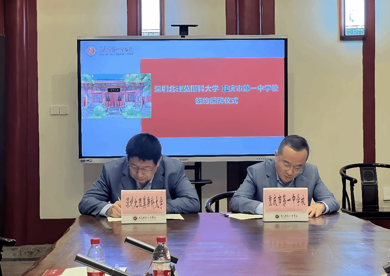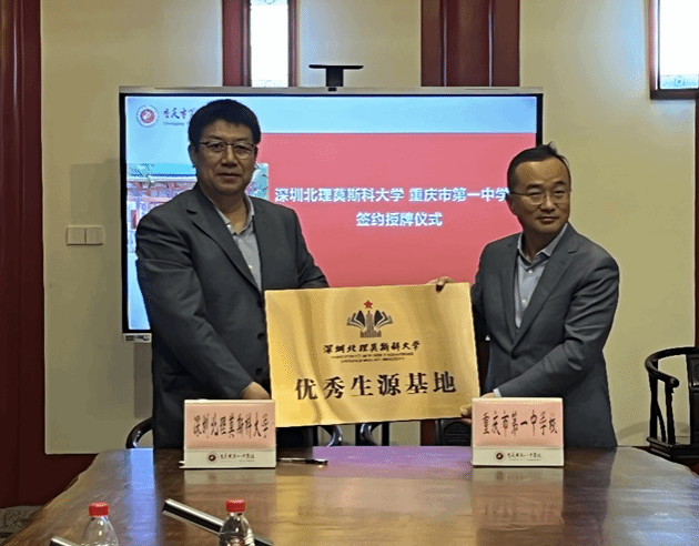 緊接著,招生組前往重慶一中,與重慶一中黨委副書記廖治華、副校長何文吉、教務(wù)處副主任王紅旗進(jìn)行了積極的交流互動。雙方就教育資源共享、學(xué)生培養(yǎng)路徑等話題交換了意見,重慶一中表達(dá)了希望教師能夠前往深北莫參觀學(xué)習(xí)的愿望,同時期待組織學(xué)生開展研學(xué)活動,張東翔教授也積極回應(yīng),表示愿意協(xié)助邀請專家到校舉辦講座,助力學(xué)生拓寬視野、提升能力。張東翔教授與廖治華副書記順利簽訂生源基地協(xié)議,并向重慶一中授予優(yōu)秀生源基地牌匾及銅盤,進(jìn)一步深化了兩校之間的合作關(guān)系。