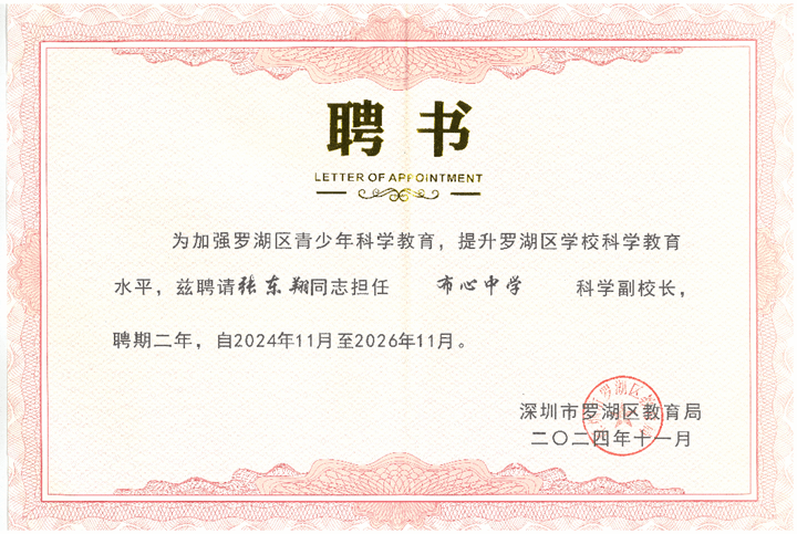 聘任儀式上,深圳北理莫斯科大學附屬布心中學正式聘請多位領域內的專家擔任重要職務。我校張東翔教授被聘任為科學副校長,深圳市公安局東湖派出所副所長洪鋼鋒受聘為法治副校長,深圳市市場監督管理局羅湖監管局東湖所副所長李志堅擔任食品安全監督副校長,中國作家協會會員徐頌翔先生受聘為少年文學院名譽院長。布心中學領導李永義書記和晏清校長共同為這些受聘專家頒發了聘書。張教授表示,他將利用自身的科研資源和教學經驗,積極推動中學與大學之間的合作,為學生提供更多接觸前沿科學的機會。