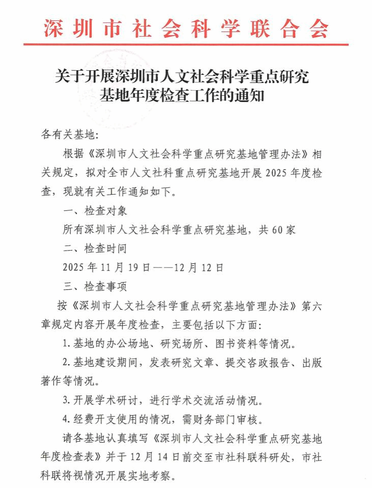 關于開展深圳市人文社會科學重點研究基地年度檢查工作的通知—基地建設—深圳市社會科學網