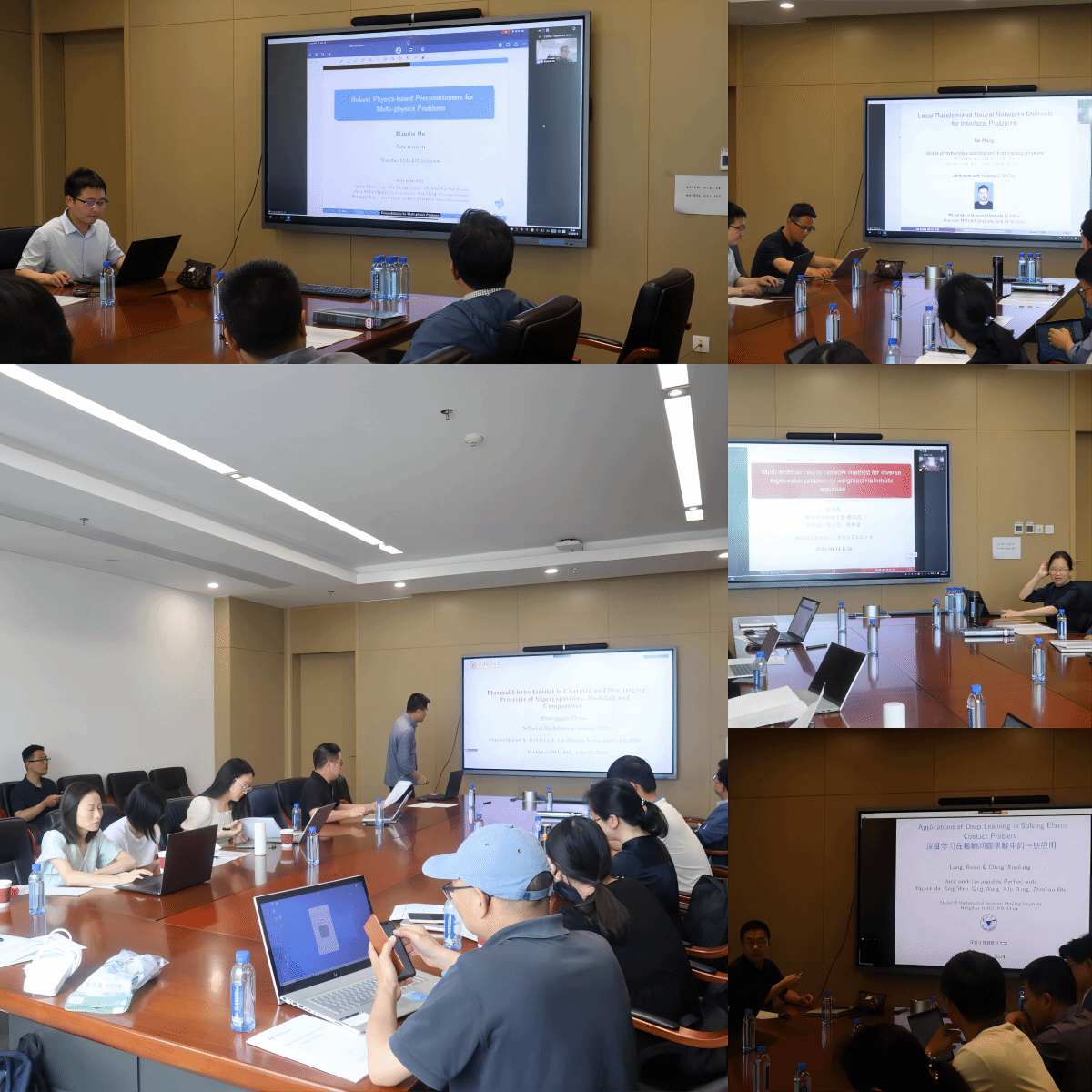 本次會議主要圍繞偏微分方程數值計算領域的最新發展和前沿動態進行討論,如深度學習在接觸問題求解中的應用、多物理問題的魯棒預處理技術、界面問題的局部隨機神經網絡方法、加權Helmholtz方程的逆特征值問題、超電容器充放電過程中的熱電動力學模型、中子傳輸方程的數值解法、時間分數擴散方程的反問題求解方法等各個方面。大會對計算數學相關領域中的前沿問題都進行了探討和交流。