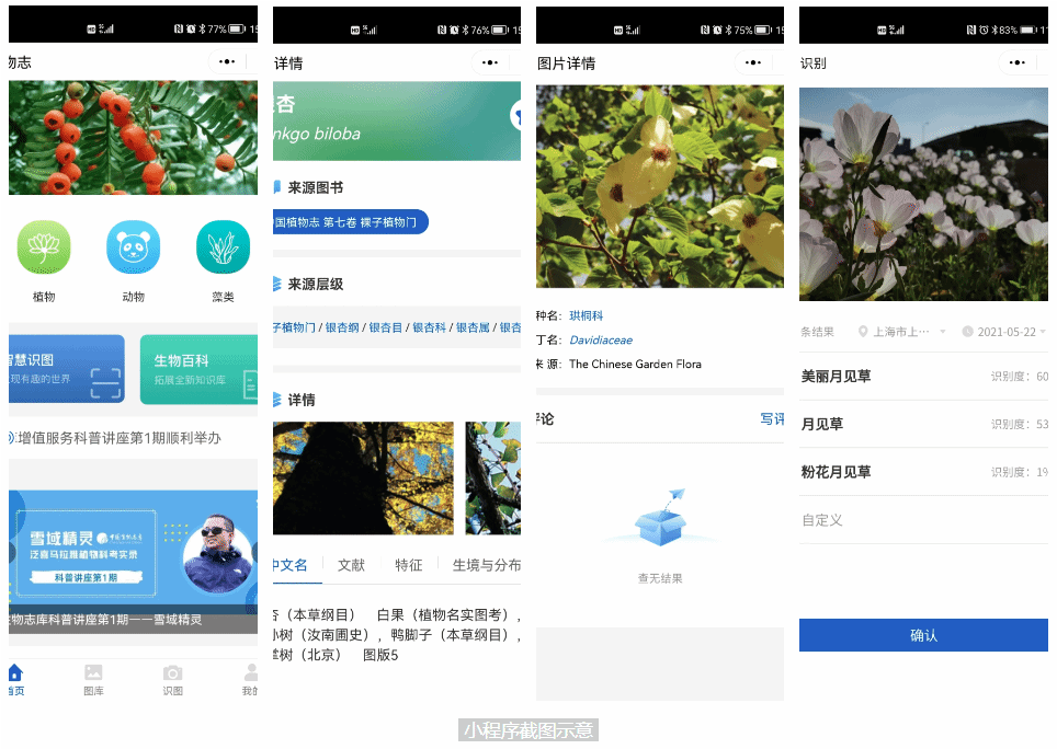 2021年小程序正式上線,為保證移動端的使用便捷性,小程序對網頁端的檢索功能做了減法,只保留了全文檢索功能。此外還增加了物種識別,可拍照/上傳識別。
