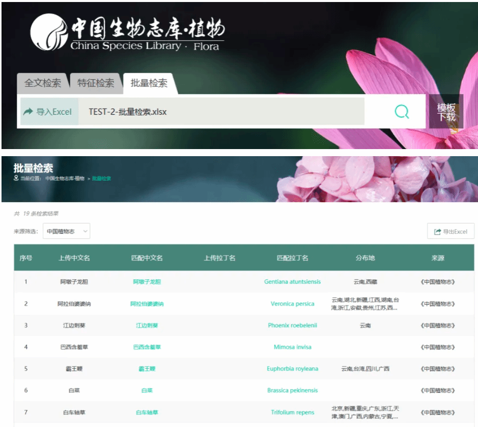 批量檢索可先行下載模板,按要求填寫待查數據,上傳excel文件即可一鍵查詢大量物種名稱。上傳中文名可匹配正確拉丁名,反之亦可,并同時返回物種分布地信息。適合做大量物種基礎調研的研究人員使用。