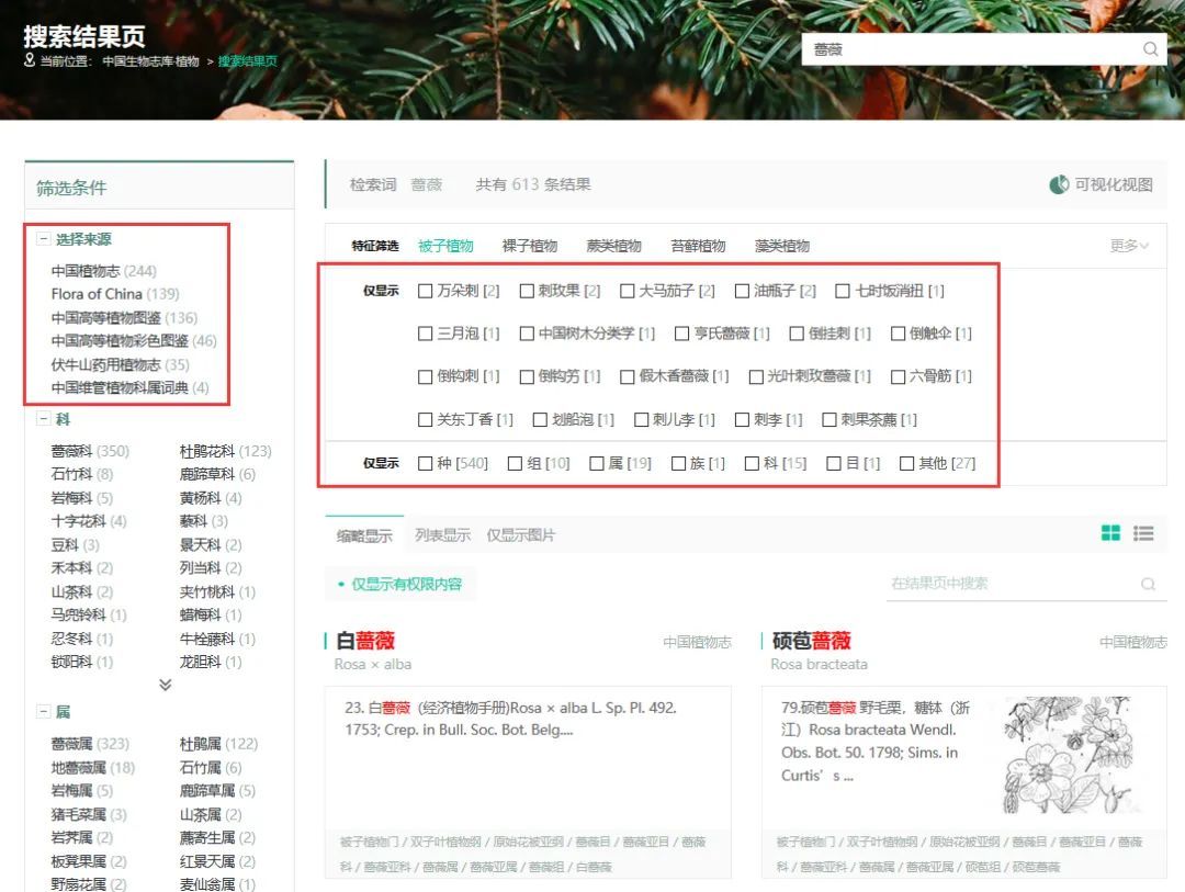 檢索結果可根據來源圖書、所屬科屬、分布地等進行聚合。同時對物種的俗名也一目了然。