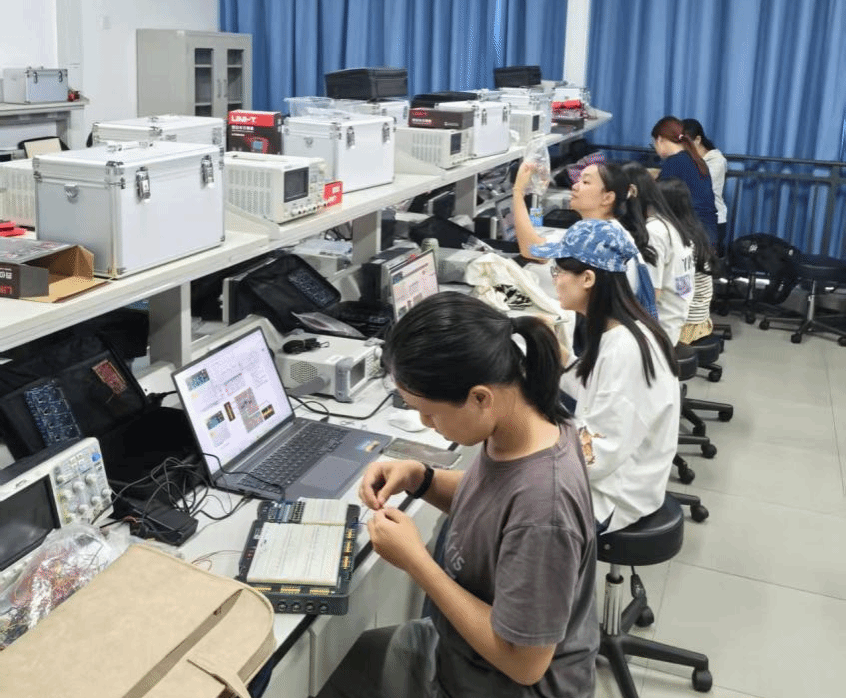 電工電子技術教學實驗室設于2號實驗樓2層(2間),面積約130㎡,配備30個實驗位置/間,實驗室采用虛擬仿真與物理設備相結合的方式,支撐電路與模擬電子學、模擬電路、數(shù)字電路、嵌入式系統(tǒng)等電工電子類課程的教學實驗與科技創(chuàng)新活動的開展。