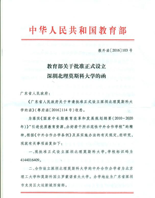 國務院總理李克強與俄羅斯總理梅德韋杰夫總理在圣彼得堡共同簽署《中俄總理第二十四次定期會晤聯合公報》明確:加強雙方高等院校間合作和教育領域多邊合作,加快推進深圳北理莫斯科大學建設。